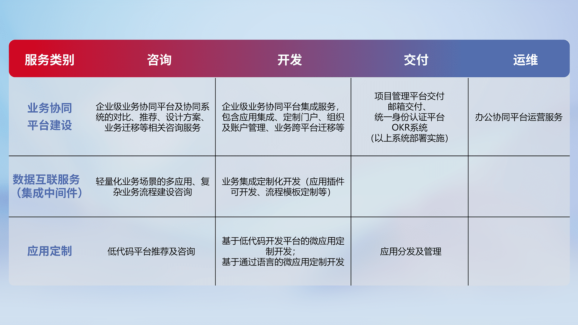 针对钉钉、、、企微、、、、IDaas等平台级产品提供产品的规划、、方案、、交付、、、、定制化开发等服务,,实现如统一协同办公、、、、智能客户服务、、混合会议管理、、、、智能数据查询、、、、等业务场景,,实现数字化转型。。。。
